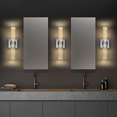 5 out of 5 stars. If you prefer a clean aesthetic, opt for modern bathroom vanity lights. For example, hang a large mirror to help make a small bathroom appear bigger. Kashima 620 mirror wall light 1174002 (0961) £107.72. Or, you can select a vanity mirror with lights for a perfectly paired combination.